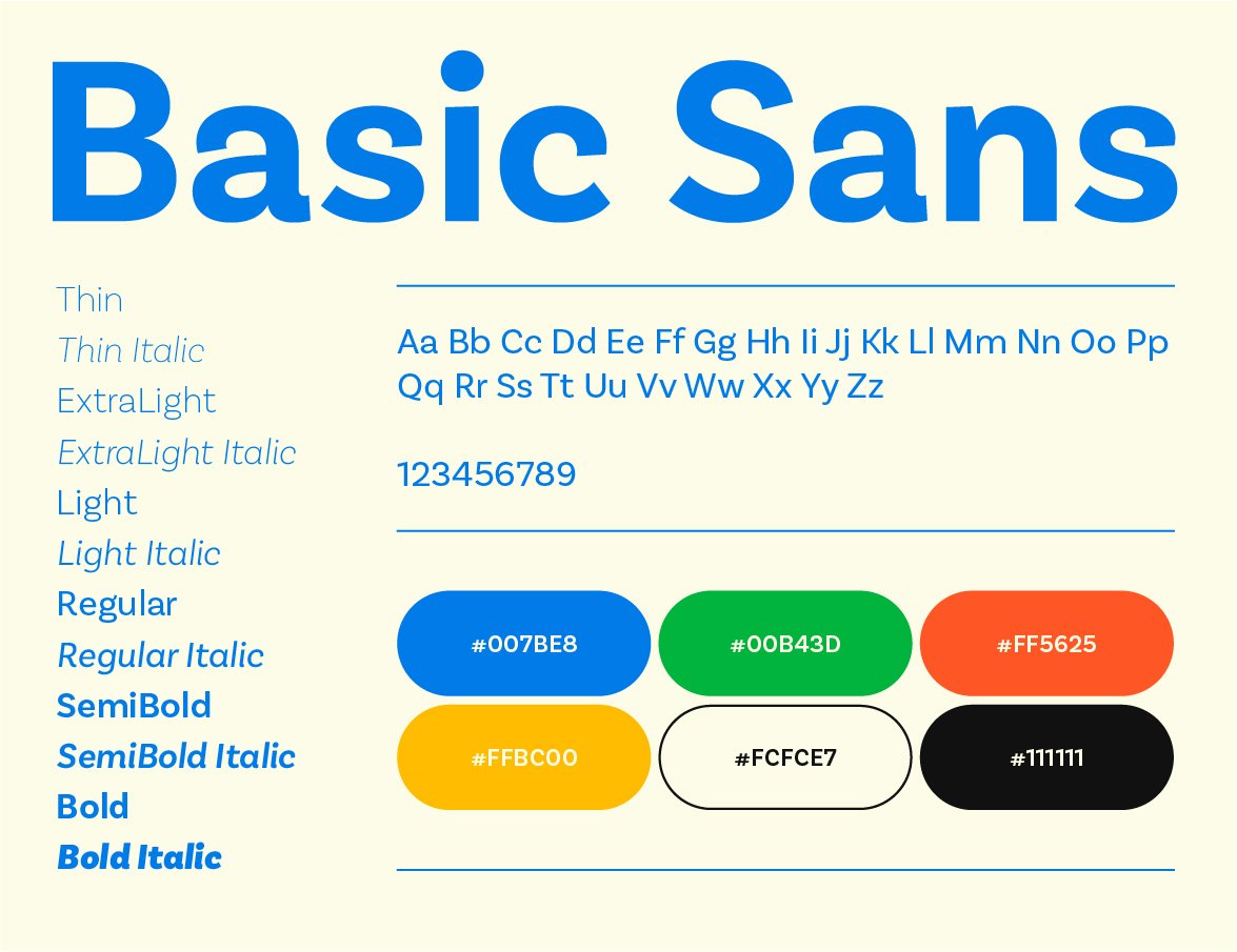 Une seule police de caractère (Basic Sans), pour écrire les noms de chaque marque, en utilisant l’ensemble des graisses disponibles.