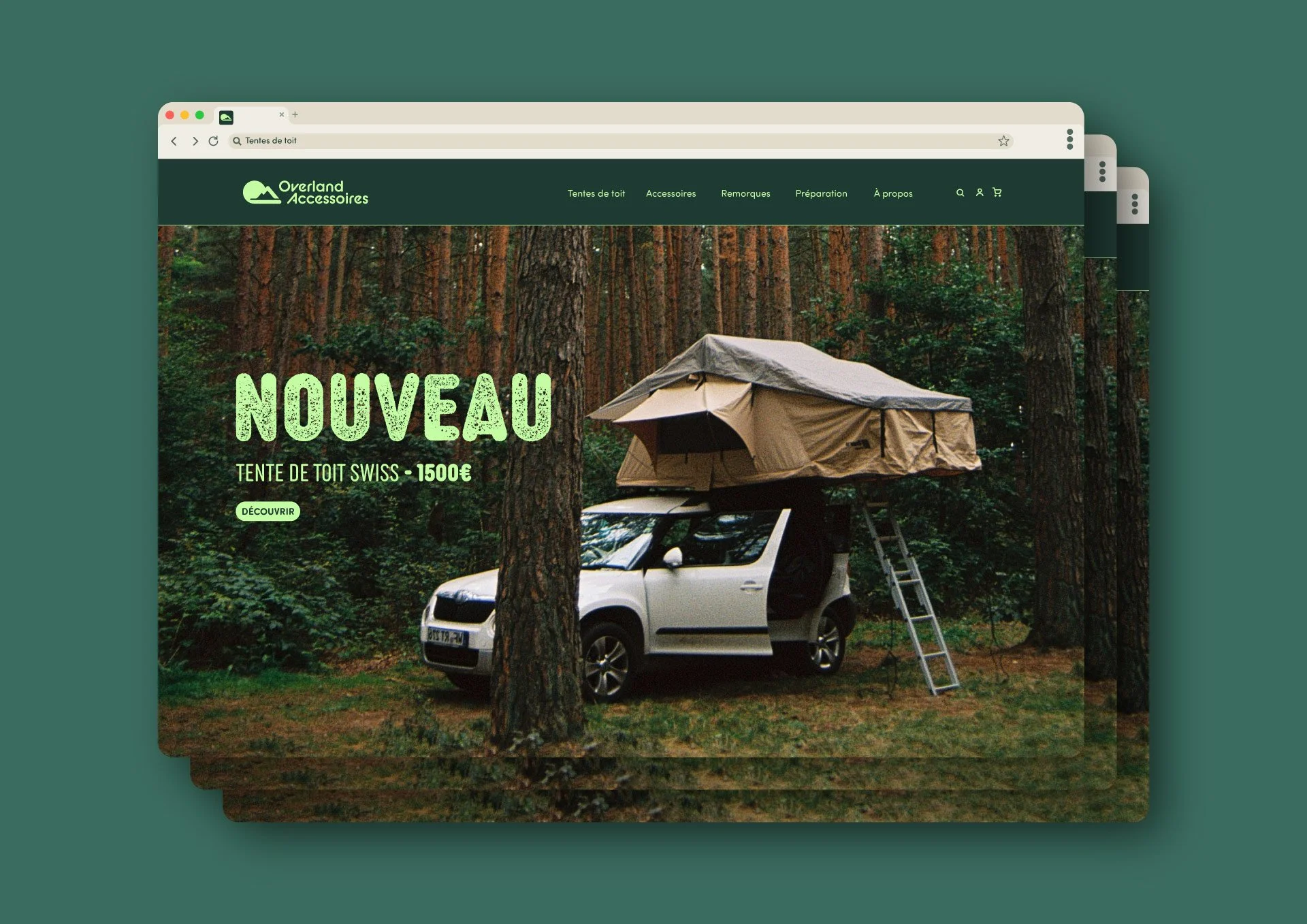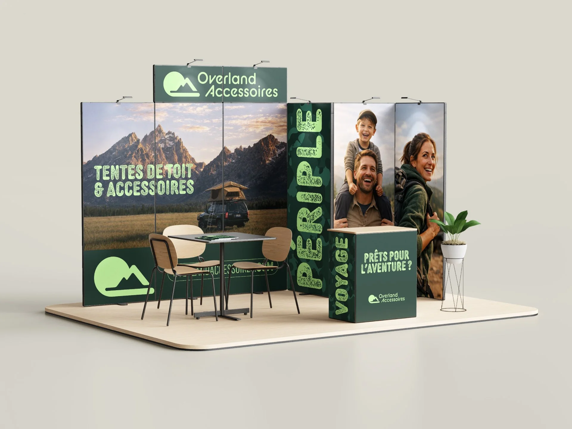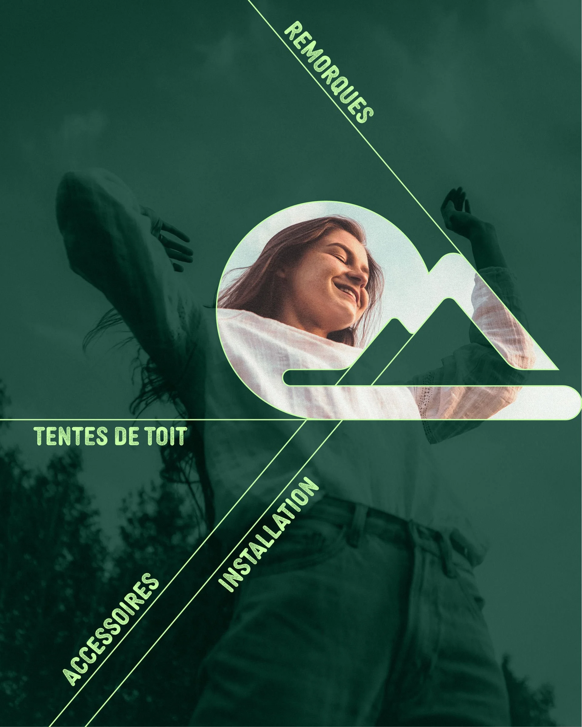 La palette de couleurs évoque la nature, l’évasion et le plaisir, tout en conservant une tonalité moderne grâce à la menthe vive. Les teintes ont été choisies pour créer une atmosphère accueillante, loin des univers trop austères ou trop techniques souvent associés à l’overlanding.
