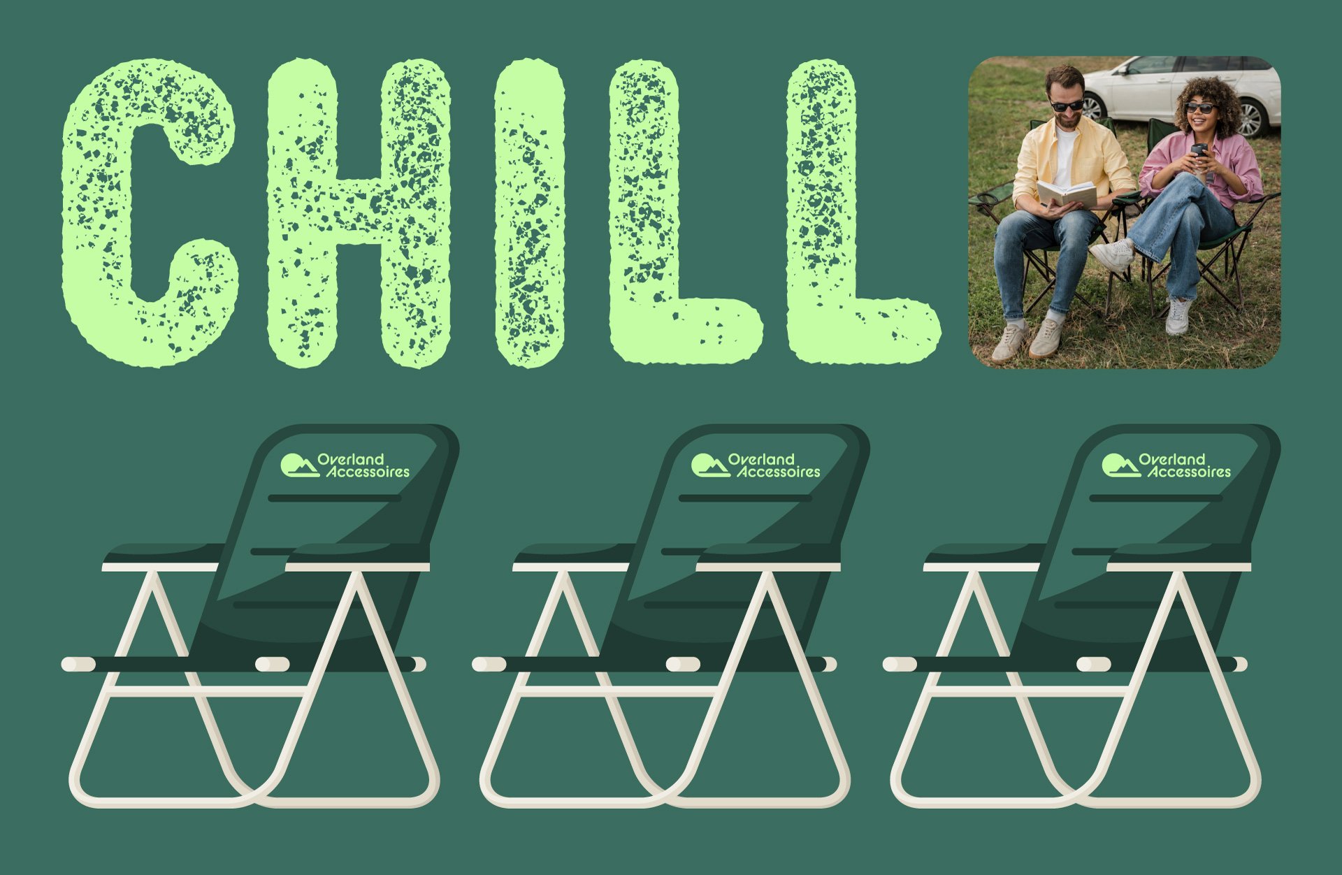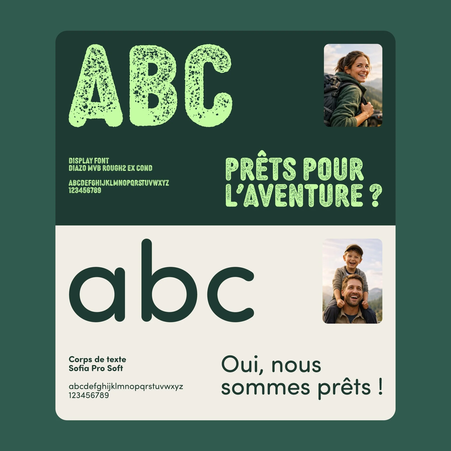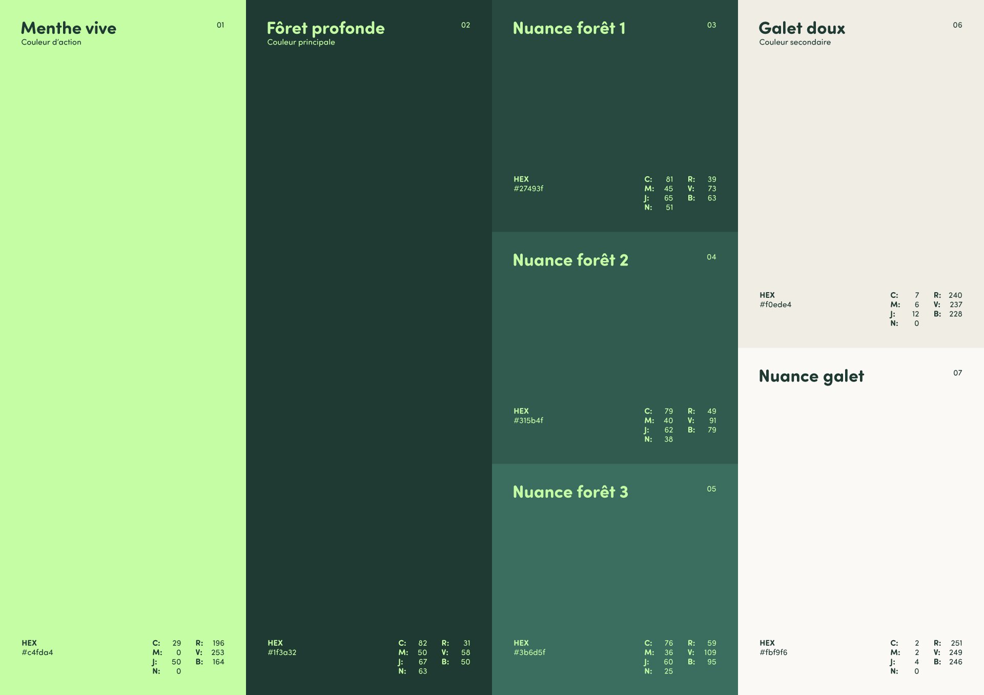 La palette de couleurs évoque la nature, l’évasion et le plaisir, tout en conservant une tonalité moderne grâce à la menthe vive. Les teintes ont été choisies pour créer une atmosphère accueillante, loin des univers trop austères ou trop techniques souvent associés à l’overlanding.